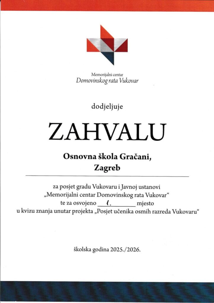 Učenici osmih razreda su od 25. – 26. 11. u pratnji razrednica Ivone Dabo i Kristine Gajski te Dražene Raguž Šimurine i Jelene Andrić sudjelovali su u terenskoj nastavi u Vukovaru. Riječ je o projektu koji obuhvaća učenje o vrijednostima Domovinskog rata i značaja Bitke za Vukovar u obrani suvereniteta i teritorijalne cjelovitosti suvremene Hrvatske.